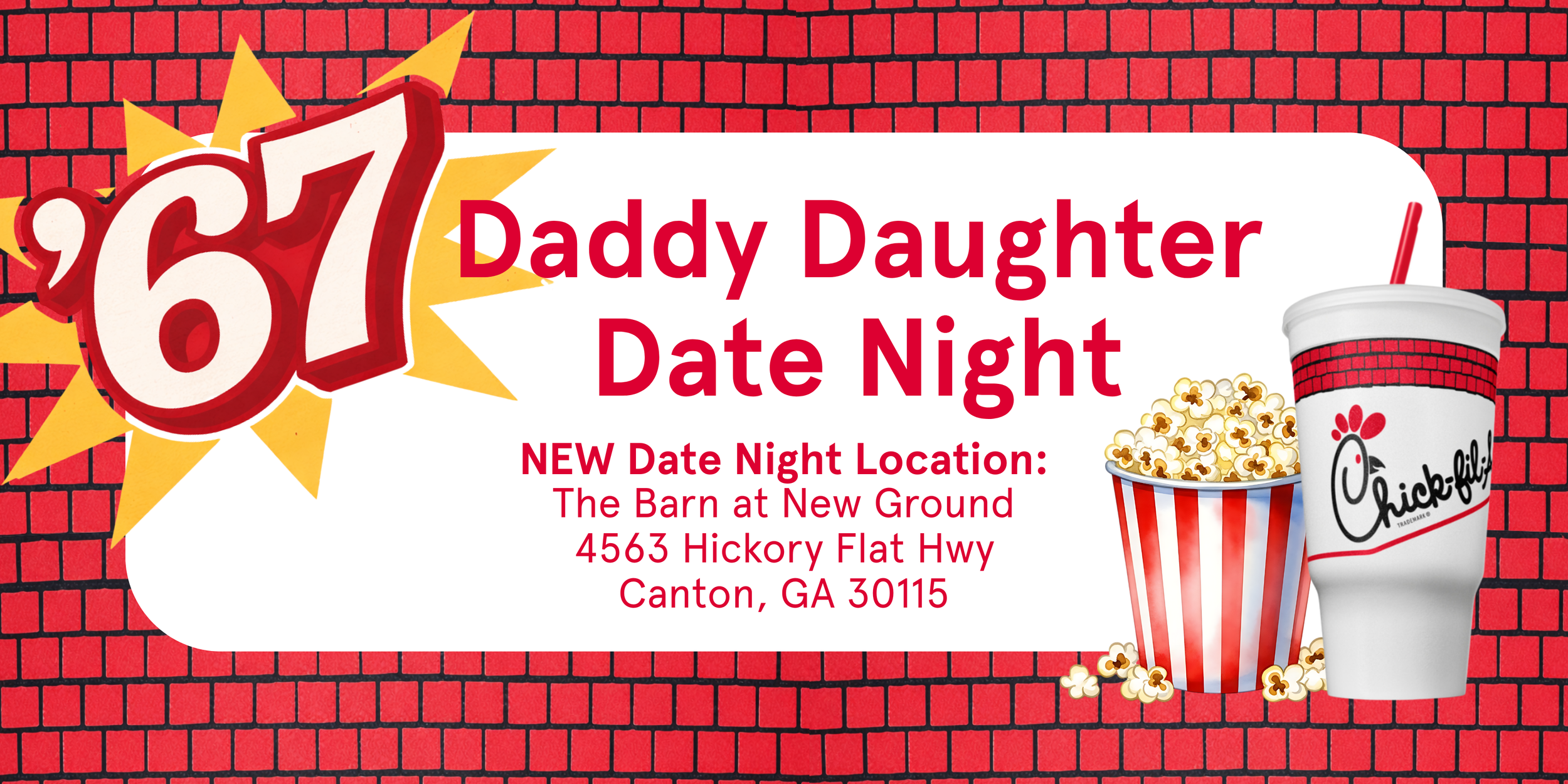 Join us for Chick-fil-A Canton’s Daddy Daughter Date Night on Saturday, February 28, 2026, featuring a special evening of ‘67, Chick-fil-A dinner, dessert, a retro ‘67 photo booth, a ‘67 collectible cup for each dad, and lots of fun memories!
